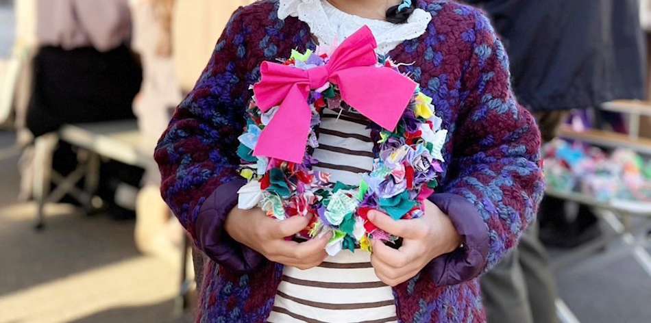 私たちシュゲイズは「自分だけのぬいぐるみをつくろう!」(@100mermaids)のぬいぐるみ制作部隊です。ぬいぐるみ作りででたハギレを使ってリースやブローチ、ステッキなどを作るワークショップを行います。