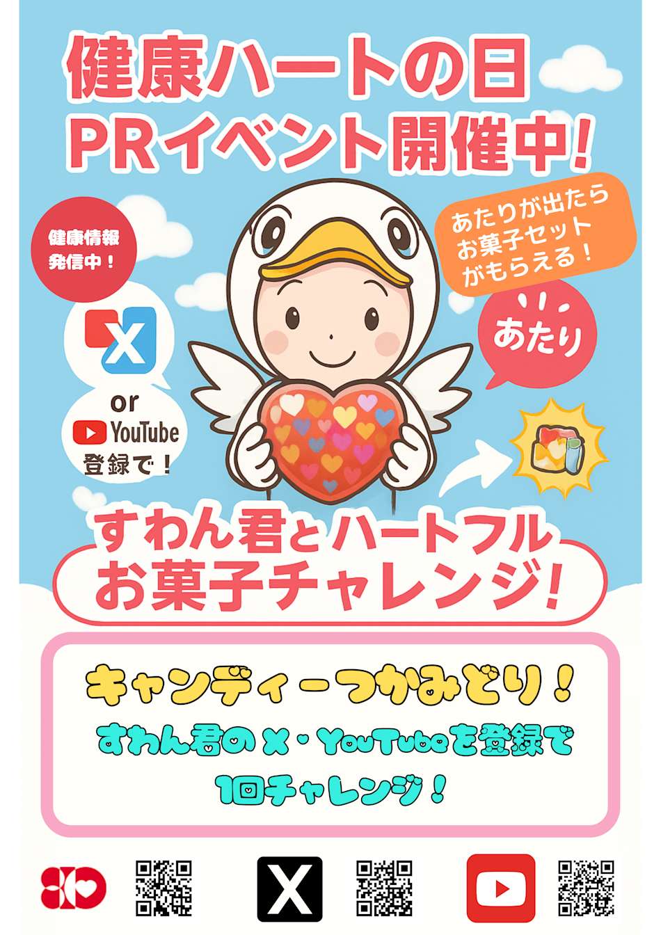 「健康ハートの日」プロジェクト(日本循環器学会など)は、心ぞうの健康をみんなと考える活動をしています。当日は、ハートのあめのつかみどりや、当たりでおかしセットが当たるチャレンジも!ステッカーももらえるよ。