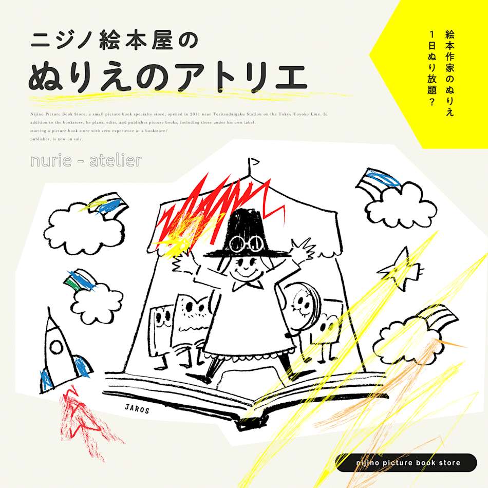 今年は、東京都目黒区に1号店、東京ドームシティ内に2号店の店舗を構える 「ニジノ絵本屋」さんと一緒に、ぬりえのアトリエ企画を実施いたします。