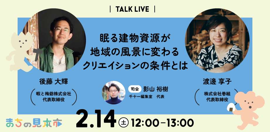 まちを舞台にする仕事、働くひとと出会うトークコンテンツや、美味しい・楽しいローカルマーケットとともに、日本各地域のまちづくりの最前線をお伝えします。