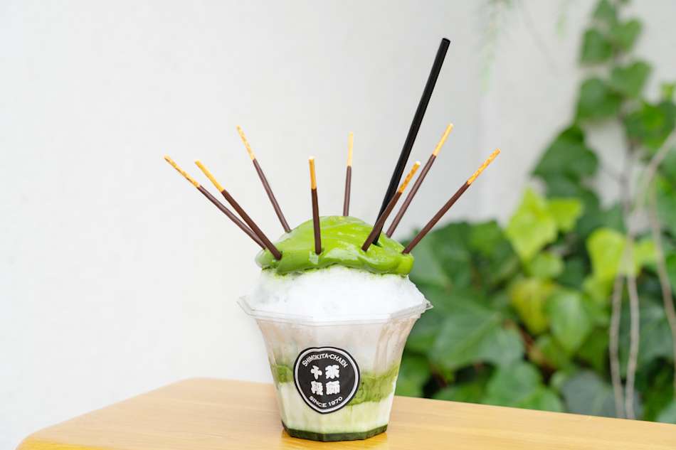 └アーモンドミルク・抹茶蜜・かき氷の層に、ポッキー<極細>が