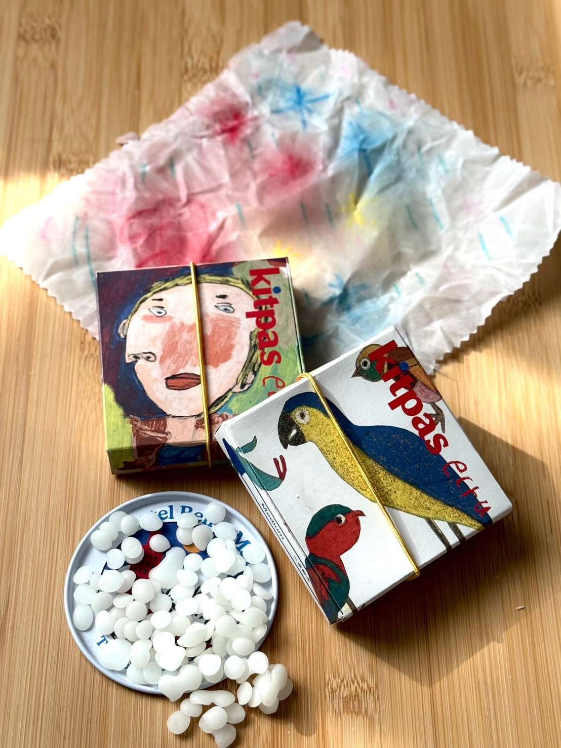 世界に一つのエコラップを作ろう!捨てられてしまうはずの布にキットパスで絵を描いて、ミツバチの副産物ミツロウを使ってミツロウラップが作れます。